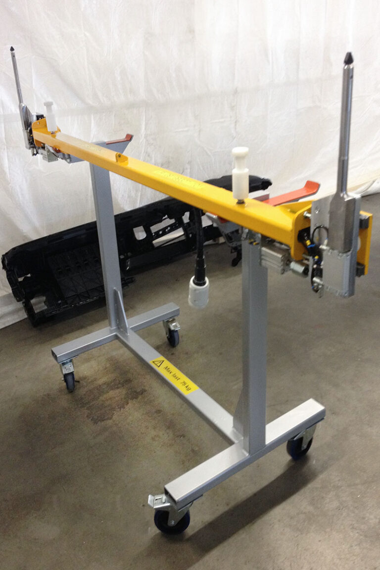 Kundenspezifische Vorrichtungen, Ständer und mobile Montagewagen zur Ergänzung von Arbeitsplatz-Hebegeräten.
